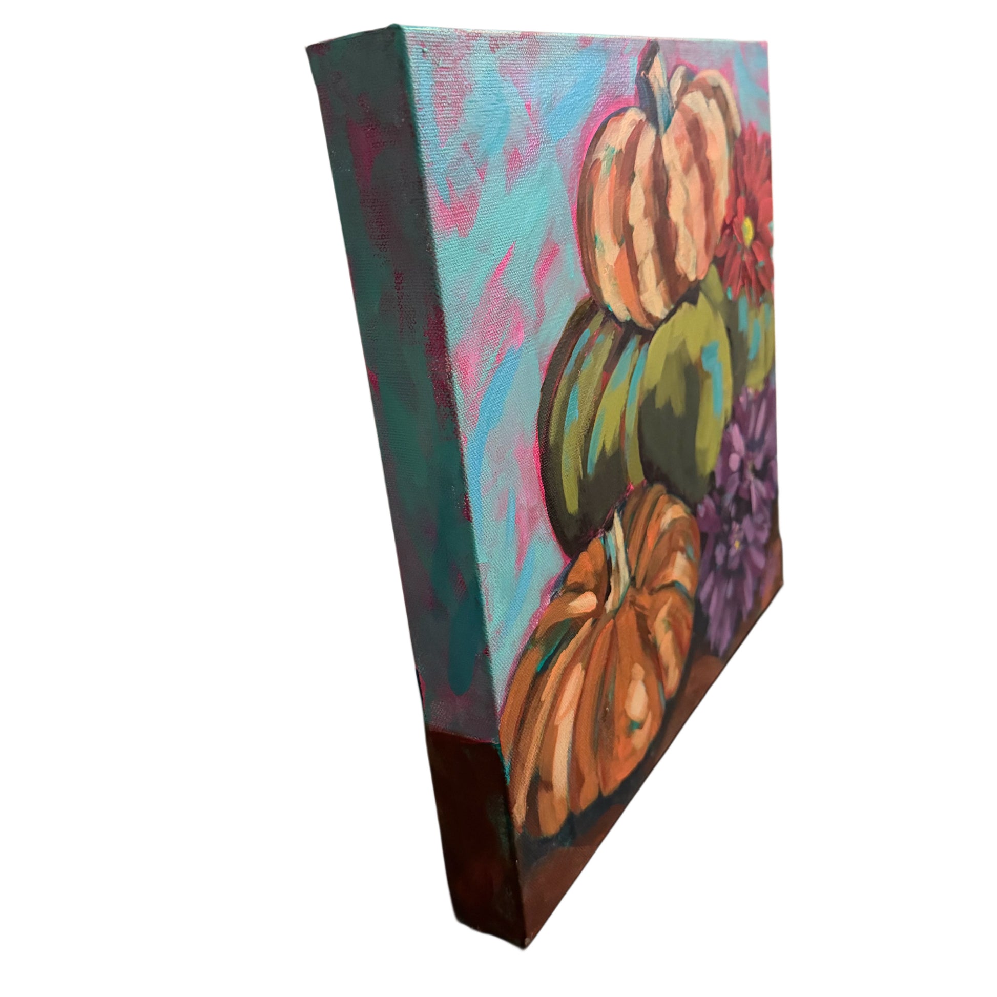 Welcome autumn with this beautiful 12x12 canvas featuring stacked pumpkins and mums in vibrant fall colors. Hand-painted with warm oranges, rich greens, and seasonal charm, this gallery-wrapped piece is ready to bring cozy fall vibes to your home. No framing needed—just hang and enjoy the season.